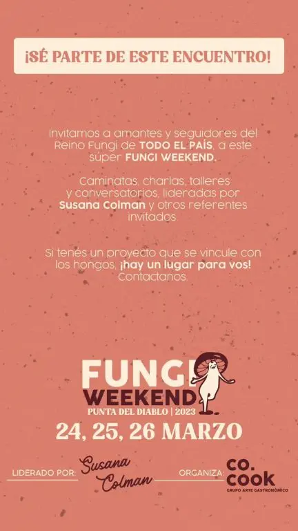 El fin de semana del 24, 25 y 26 de marzo de 2023, Punta del Diablo será el epicentro del Fungi Weekend, el evento de apertura de la temporada de hongos liderado por la reconocida micóloga Susana Colman y organizado por Co.Cook - Grupo Arte Gastronómico.
