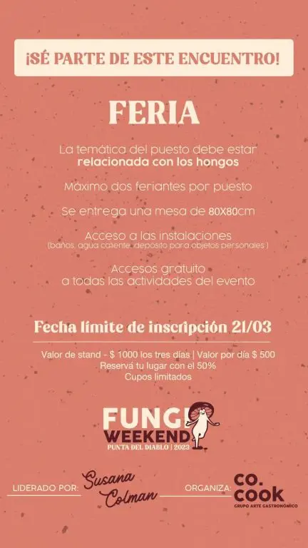 Para aquellos interesados en tener un puesto en la feria, los requisitos son simples: la temática del puesto debe estar relacionada con los hongos, y se permite un máximo de dos feriantes por puesto. Se entregará una mesa de 80 por 80 centímetros, y se brindará acceso a las instalaciones, que incluyen baños, agua caliente y un depósito para objetos personales. Además, el acceso a todas las actividades del evento es gratuito.